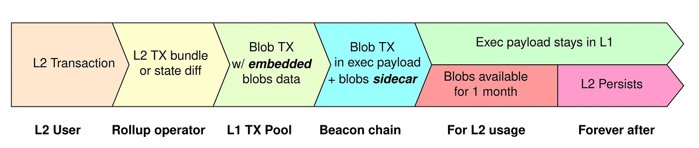 The purpose of blobs is to add a 'data-layer' to Ethereum without breaking composability. A blob will be available for just enough time (1 month) to ensure that the rollup-sequencer can challenge the state of the L2. The 'life of a blob' can be viewed in the image below.
