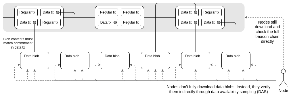 With data availability sampling, nodes on Ethereum don't have to fully download these blobs containing rollup transactions. Instead, they take samples from the blob to become confident that the data is available. The more samples that the node takes from the blob, the more confident it becomes that the data is available (which is important from a security perspective). The thread below by Nick White, COO of Celestia Labs, provides a great overview of DAS.